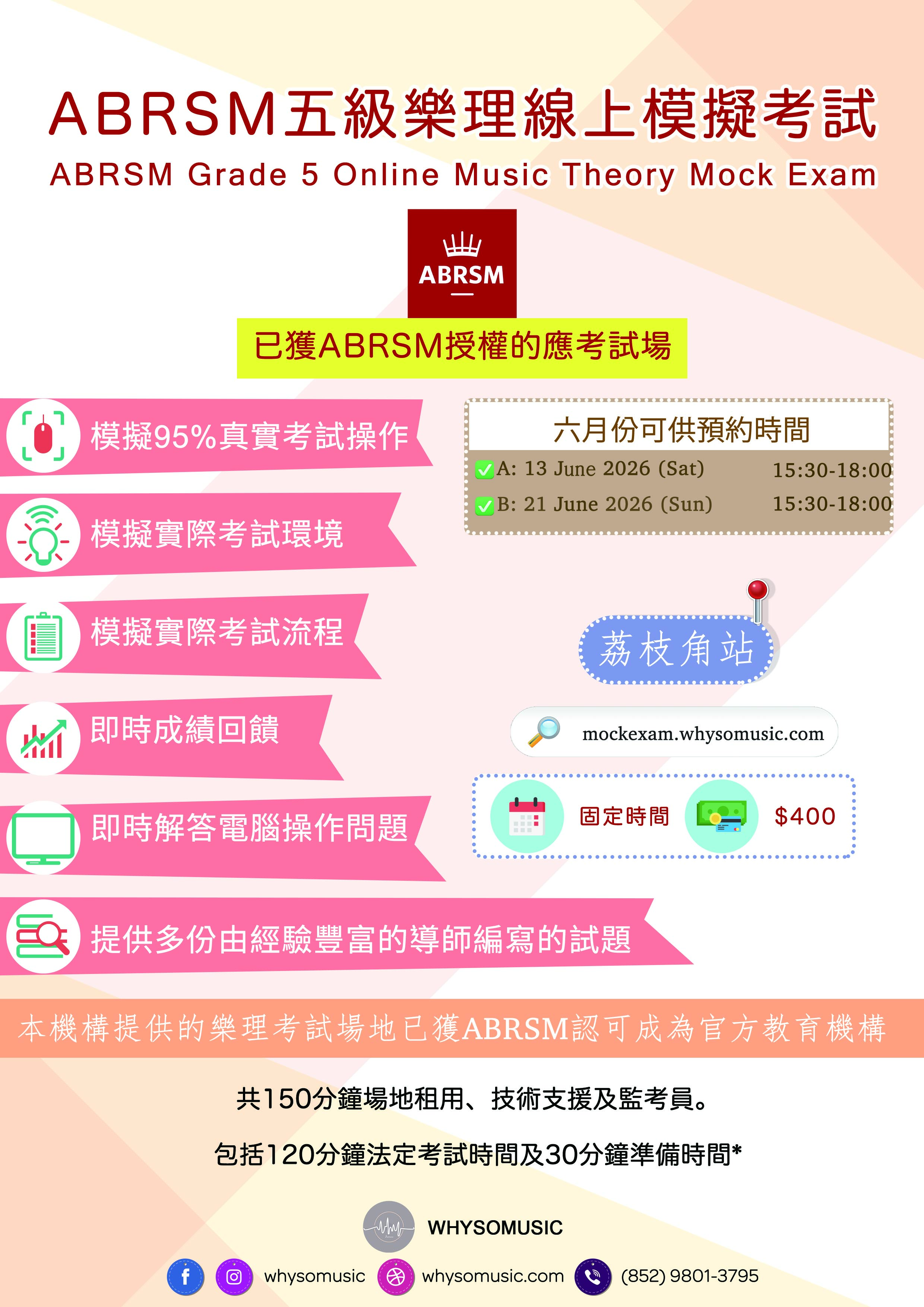 Whysomusic is the first institution in Hong Kong to offer an ABRSM Grade 5 Music Theory Mock Exam. This exam will be held at an ABRSM-authorized and certified exam venue, ensuring the highest standards and providing an excellent testing environment for candidates. Hosting the mock exam helps candidates become proficient in using computer equipment and mastering relevant software application skills. Through this mock exam, candidates will familiarize themselves with the exam format and requirements, helping them excel in the real exam. During each mock exam, we provide professional invigilators and technical support staff. They assist candidates in using the computer equipment and related software for the exam, and provide timely support and solutions in case of any issues during the exam. By establishing such a support system, we ensure that candidates receive the necessary assistance and guidance throughout the entire exam process, allowing them to focus on completing the exam without worrying about technical difficulties. We are committed to providing a stress-free and well-supported exam environment, enabling every candidate to showcase their potential and build a solid foundation for their future in music. Through the mock exam, candidates will be better prepared to face the challenges of the real exam, enhancing their music theory knowledge and application skills. We look forward to witnessing the growth and progress of candidates in this exam environment, offering them valuable support and guidance on their musical journey.